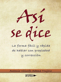 Así se dice: La forma fácil y rápida de hablar con propiedad y corrección Calificación: 0 de 5 estrellas0 calificacionesOrtografía Calificación: 3 de 5 estrellas3/5Lo pienso bien y lo digo mal: Notas idiomáticas para el correcto uso del idioma Calificación: 0 de 5 estrellas0 calificacionesGuíaBurros El porqué de las frases hechas II: Significado, origen y uso, para hablar y escribir mejor Calificación: 0 de 5 estrellas0 calificaciones¿Te la sabes?: Seleccionario de palabras que se usan poco Calificación: 4 de 5 estrellas4/5Temas para Hispanohablantes Calificación: 0 de 5 estrellas0 calificacionesInglés en 10 días: Curso fácil con un nuevo método Calificación: 0 de 5 estrellas0 calificacionesGuíaBurros: Fraseología Español-Inglés Calificación: 0 de 5 estrellas0 calificacionesDiccionario breve del español yucateco Calificación: 0 de 5 estrellas0 calificacionesInglés: Ejercicios prácticos para escribir y hablar fácilmente Calificación: 5 de 5 estrellas5/5Diccionario del español de México: Volumen 1 Calificación: 5 de 5 estrellas5/5Diccionario de frases populares en la literatura cubana Calificación: 0 de 5 estrellas0 calificacionesManual para hablar mejor Calificación: 5 de 5 estrellas5/5Ortografía Lógica: Libro De Trabajo Calificación: 0 de 5 estrellas0 calificacionesEnlace 2: Curso de Español para Extranjeros (Nivel Medio) Libro de ejercicios: Comunicación Panhispánica al Alcance del Mundo Calificación: 0 de 5 estrellas0 calificacionesGramática de la lengua castellana destinada al uso de los americanos Calificación: 0 de 5 estrellas0 calificacionesEjercicios en inglés de tiempos verbales Calificación: 0 de 5 estrellas0 calificacionesCon buenas palabras: Todo lo que necesitas para expresarte mejor Calificación: 0 de 5 estrellas0 calificacionesFrancés aprender y hablar - Curso básico Calificación: 0 de 5 estrellas0 calificacionesAsí se habla Calificación: 0 de 5 estrellas0 calificacionesNuestras palabras: entre el léxico y la traducción Calificación: 3 de 5 estrellas3/5No se duerman: Historias policiales Calificación: 0 de 5 estrellas0 calificacionesEl árbol de la lengua Calificación: 5 de 5 estrellas5/5Libro de Vocabulario Turco: Un Método Basado en Estrategia Calificación: 0 de 5 estrellas0 calificacionesLa excepción en la gramática española: Perspectivas de análisis Calificación: 0 de 5 estrellas0 calificacionesCurso de Ortografía y Redacción Calificación: 0 de 5 estrellas0 calificacionesBusiness English. Manual de inglés de los negocios Calificación: 0 de 5 estrellas0 calificacionesDos en Uno Relampago Espanol Latinoamericano para Extranjeros en Nivel Basico e Intermedio Calificación: 5 de 5 estrellas5/5Las perífrasis verbales en español Calificación: 0 de 5 estrellas0 calificacionesGramática Grammar: Un Estudio Comparativo De La Gramática Española E Inglesa Calificación: 0 de 5 estrellas0 calificaciones