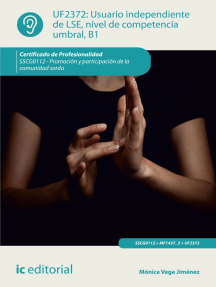 Usuario independiente de LSE, nivel de competencia umbral, B1. SSCG0211 Calificación: 0 de 5 estrellas0 calificacionesUsuario independiente de LSE, nivel de competencia avanzado B2.2. SSCG0112 Calificación: 0 de 5 estrellas0 calificacionesUsuario básico de LSE, nivel de competencia A1 y A2. SSCG0112 Calificación: 0 de 5 estrellas0 calificacionesUsuario básico de LSE, nivel de competencia A1 y A2. SSCG0211 Calificación: 0 de 5 estrellas0 calificacionesHabilidades de comunicación y promoción de conductas adaptadas de la persona con discapacidad. SSCG0109 Calificación: 0 de 5 estrellas0 calificacionesPrevención de conflictos. SSCG0209 Calificación: 0 de 5 estrellas0 calificacionesOrganización y gestión de acciones de dinamización de la información para jóvenes. SSCE0109 Calificación: 0 de 5 estrellas0 calificacionesApoyo en la recepción y acogida en instituciones de personas dependientes. SSCS0208 Calificación: 0 de 5 estrellas0 calificacionesSensibilización social y cultural de la realidad de las personas sordas. SSCG0112 Calificación: 0 de 5 estrellas0 calificacionesApoyo en la organización de actividades para personas dependientes en instituciones. SSCS0208 Calificación: 0 de 5 estrellas0 calificacionesUF1756 - Documentación e informes en consumo Calificación: 0 de 5 estrellas0 calificacionesMedios de protección y armamento. SEAD0212 Calificación: 0 de 5 estrellas0 calificacionesEl mediador comunicativo en el equipo interdisciplinar educativo. SSCG0211 Calificación: 0 de 5 estrellas0 calificacionesUsuario independiente de LSE, nivel de competencia avanzado B2.1. SSCG0211 Calificación: 0 de 5 estrellas0 calificacionesIntervención educativa del mediador comunicativo. SSCG0211 Calificación: 0 de 5 estrellas0 calificacionesComunicación Aumentativa Alternativa. Fundamentos lingüísticos.: Intervención y Evaluación Calificación: 5 de 5 estrellas5/5Lengua oral: destino individual y social de las niñas y los niños Calificación: 0 de 5 estrellas0 calificacionesMF1104_3 - Gestión de departamentos de servicio de alimentos y bebidas Calificación: 0 de 5 estrellas0 calificacionesInfluye en la conducta humana: 2 EN 1: Cómo potenciar tu inteligencia emocional para persuadir fácilmente a quien sea Calificación: 0 de 5 estrellas0 calificacionesComunica Sin Hablar Calificación: 0 de 5 estrellas0 calificacionesLenguaje escrito y dislexias: Enfoque cognitivo del retardo lector - Sexta edición ampliada Calificación: 5 de 5 estrellas5/5UF0259 - Servicio y atención al cliente en restaurante Calificación: 0 de 5 estrellas0 calificacionesCómo vencer el estrés en el trabajo: una guía de supervivencia en la oficina Calificación: 0 de 5 estrellas0 calificacionesLa práctica del Aprendizaje Cooperativo: Propuestas operativas para el grupo-clase Calificación: 5 de 5 estrellas5/5La puesta en escena de sus mensaje: Palabras, voz y cuerpo Calificación: 0 de 5 estrellas0 calificacionesEl cerebro Calificación: 0 de 5 estrellas0 calificaciones¡Si yo te contara!: Sobre cómo comunicar en ciencia y otras hierbas Calificación: 0 de 5 estrellas0 calificacionesTécnicas de comunicación con personas dependientes en instituciones. SSCS0208 Calificación: 0 de 5 estrellas0 calificacionesImán de Relaciones Calificación: 0 de 5 estrellas0 calificacionesPNL para principiantes Paso a paso hacia un mayor éxito con psicología sencilla, técnicas de manipulación y el lenguaje corporal adecuado Calificación: 0 de 5 estrellas0 calificaciones